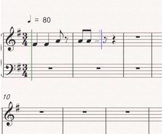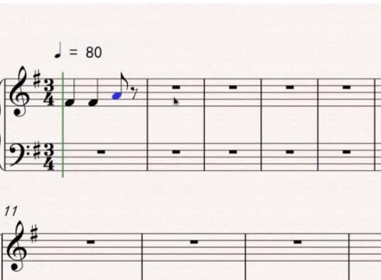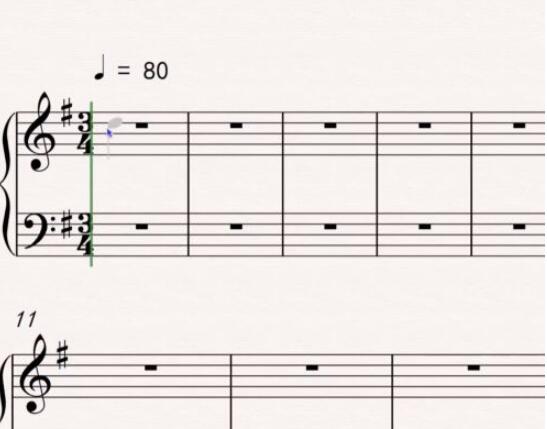 比如我们选择一个四分音符,然后将鼠标放在创作好的五线谱中,会发现鼠标位置变成了灰色的音符,这时候我们点击下去,就可以在相应的位置创建音符了。