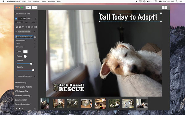Mac支持目前大部分流行的图像格式,包括BMP、PCX、TIFF、GIF和JPEG等,且它采用极其先进的文字平滑技术和文字水印效果,而这些效果完全和Photoshop相媲美。在用户进行水印的同时,还可使用内置的基本工具来进行图片的基本修改,包括图片剪切、自动对比度和手动对比度等功能,这些功能可让图片处理、水印添加变得更加方便与快捷。