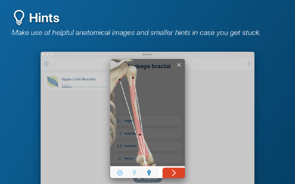 Mac版旨在通过几个简单的步骤彻底自我测试并加强你对肌肉、血管和神经的解剖学知识。Anatom