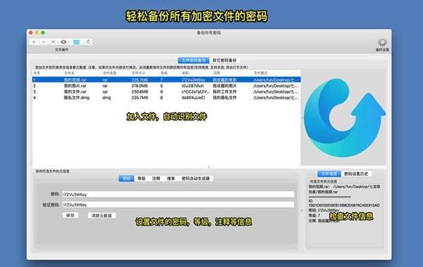 1) 轻松保存加密文件的密码等信息到本地数据库,包括Rar,Zip,Pdf,7Zip等文件. 所有文件通过内容的md5识别,即使文件被重命名或移动到其它位置也能轻松被识别。