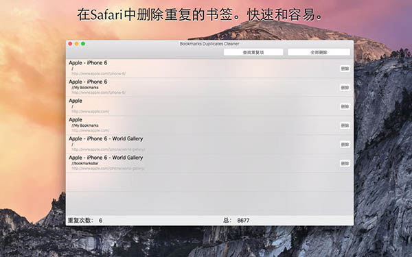 只需点击“查找重复项”,应用程序将显示你所有重复书签的Safari。然后你可以删除它们。