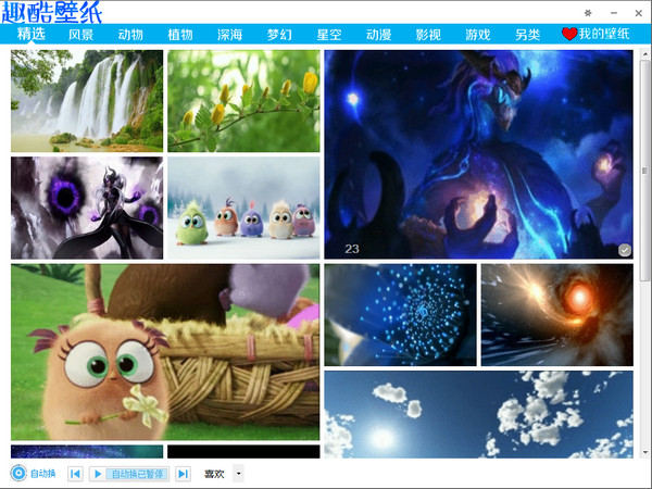趣酷壁纸安装方便快捷,只需通过官网下载安装即可使用,然后打开软件下载想要的动态壁纸,壁纸分类:游戏、动漫、星空、影视、风景、动物、植物、护眼等动态桌面壁纸,数量达到3000以上,满不同的用户动态桌面需求。