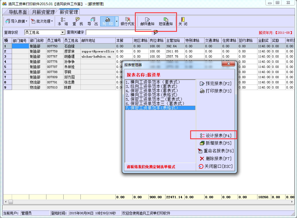 由于不同公司的工资项目及所用纸张都可能不同,追风工资单软件中,支持用户自定义打印格式功能,用户可以依据自己公司的要求,设计和定义自己的工资单打印格式。同时系统中也提供了邮件提醒及短信发工资提醒的功能。