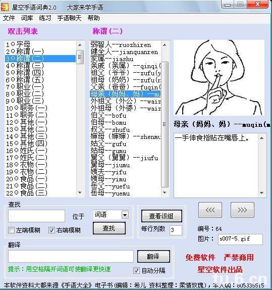 星空手语词典绿色版是一款相当实用的手语词典工具。星空手语词典官方版功能强劲,收录了手语词汇4400多个,支持浏览、查询、句子翻译等功能,图文并茂,可以添加修改词库,是学习手语的好工具。