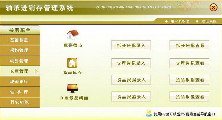 4、仓库管理:库存盘点、货品库存、仓库货品明细、拆分装配录入、拆分装配查看、仓库调拨录入、仓库调拨查看、报损录入、报损查看、溢出录入、溢出查看;