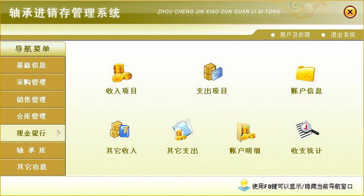 5、现金银行:收入项目、支出项目、账户信息、其它收入、其它支出、账户明细、财务收支统计;
