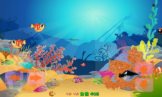 《大鱼吃小鱼》是一款游戏厅经典休闲益智小游戏,在看似风平浪静的大海里,却隐藏着与人类世界相同的危机,海底生物在弱肉强食的竞争下,用以大吃小的方式获得生存,你不但得觅食以填饱肚子,更重要的是学会保护自已!主角一开始是一条很小的热带鱼,游戏的方式是让主角先吃下与自已体型相同的鱼,等吃下一定的数量且主角的体型变大后,就能再吃下其它体型更大的鱼类,而且只要让“CROWTH”的值填满,就能进入到下一关;但海底世界里的危机随时都存在着,主角必须避开体型比自已大的鱼类,否则是会被吃进肚子里。 游戏分为两种模式:“New Game”:只要填满“CROWTH”的值,就能前往下一关;在此模式中陆续出现小海星,只要取得就能加分。“Game Attact”:此种模式有时间限制,玩家必须在时间内将“CROWTH”值填满,才能进入下一关;还有,画面中将会陆续出现小时钟,只要取得它,就能够不停的延长游戏时间。 游戏操控方式:使用鼠标操控方向。SPACE键,快速往前冲。