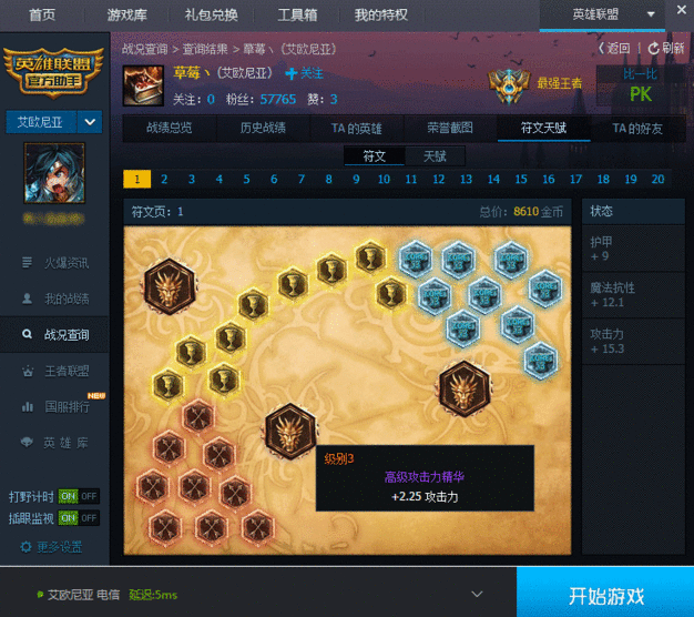 英雄联盟lol助手(英雄联盟官方助手)是腾讯官方发布的一款网游英雄联盟的辅助插件,提供最新的独门秘籍,带您超神,带您飞。官方全量数据支持,战绩统计更加全面,查询结果更加精准,更可显示最近200场对局记录。