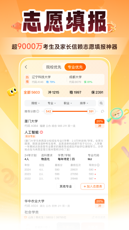 掌上高考app模拟各省志愿填报系统,预测考生拟填报志愿的风险概率,对比意向高校一致的考生人数,给与更加合理、有效的择校推荐!