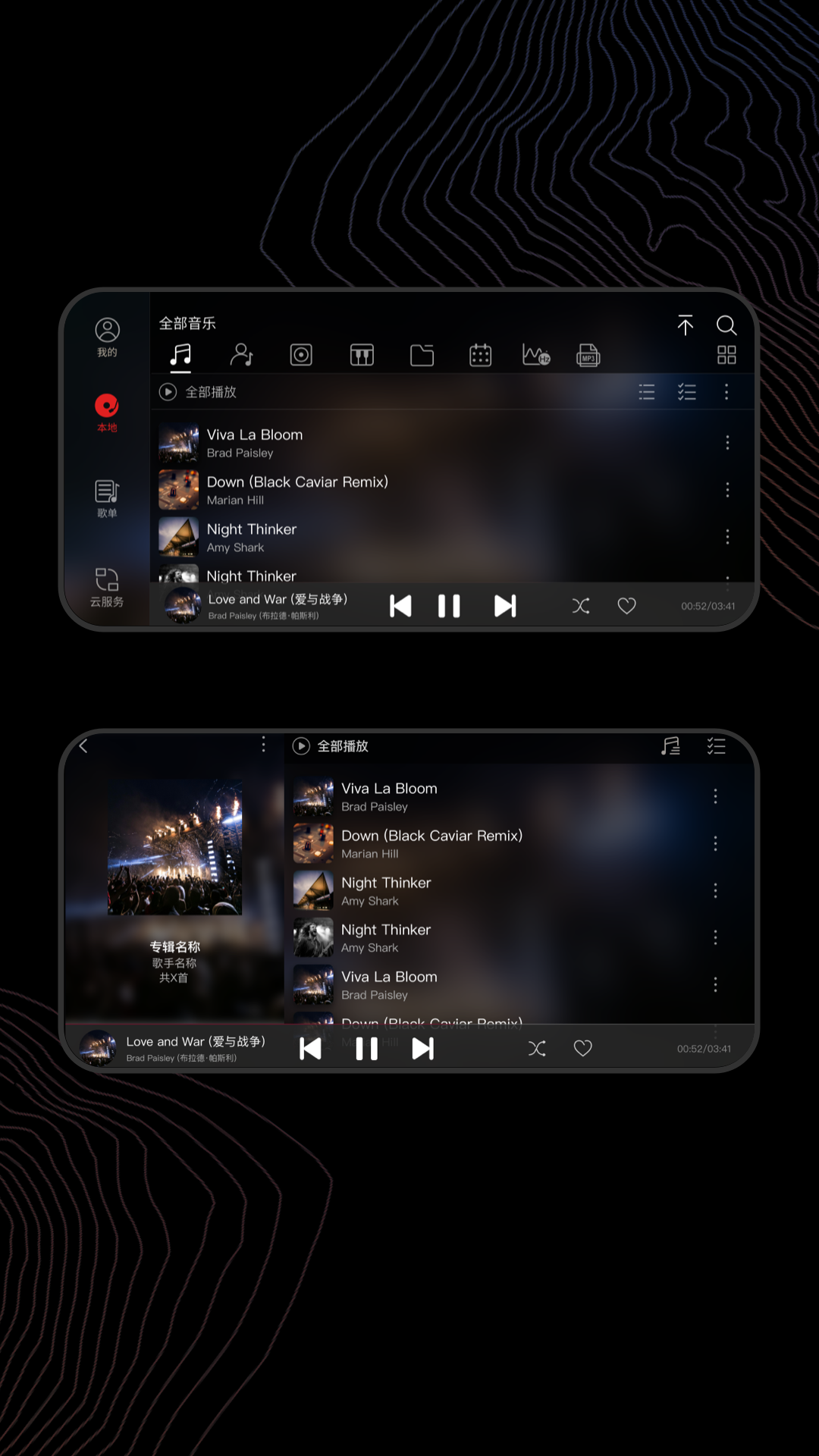 5、支持全部歌曲,专辑(按音轨号排序),艺术家,风格,文件夹,自定义列表等分类播放;