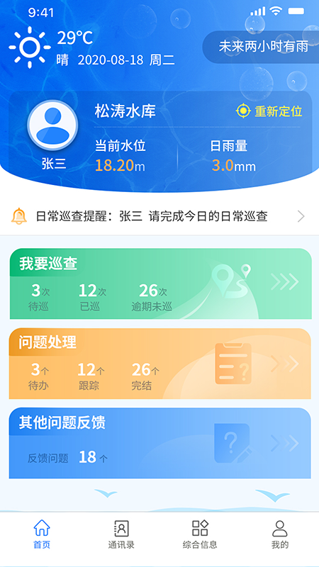 提供水雨情监管、问题工单处理、天气预报、维修养护等功能,实现巡查过程和结果的可视化留痕管理