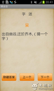 猜谜语是一款集合日常生活及趣味的谜语答题小游戏,谜语是从有元宵节以来大众必玩的活动,全民可参与,老少皆宜。我们整合了现在最为流行的谜语题目,制作成了答题游戏,绿色资源网所有玩家利用日常碎片时间随时娱乐。谜语是中国文化独有的内容。谜语,有制谜人和猜谜人,顾名思义就是制谜人造谜,谜一定要巧妙,然后由猜谜人解谜。在中国有悠长历史,流传面广,种类繁多,变化无穷。它在文人雅士中流行。本应用的字谜每个都带有谜底的解释,让你不再怕为什么会是这个谜底了。