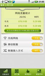 这是一款关于上网管理的软件,可以为用户提供流量监测服务,随时都能查看自己的数据使用情况,让你更了解自己的流量耗费,还有贴心的流量开关,能够自行关闭那些非常消耗流量的软件,有些根本不用的软件也能关闭,杜绝那些偷流量的app,很好用哦!