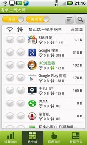 目前最领先的网络防火墙,集所有信息于一页面,对流量情况和操作得心应手:分应用统计流量,分WIFI和2G/3G统计流量,显示正在运行(绿色应用名称)和正在联网(绿色上网符号)的应用!便捷的程序流量查找,可按关键字搜索,按WIFI或2G/3G流量大小、按选中、按联网状态、按运行状态排序等。