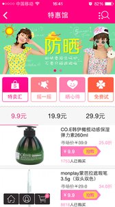 到特惠商城抢特卖单品、摇一摇得优惠奖励、分享show以及申请试用等,在线支付,查物流信息等。