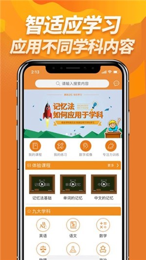 使用记忆法可以在此学习校园九大学科,语数外、物理化和政史地九大学科;