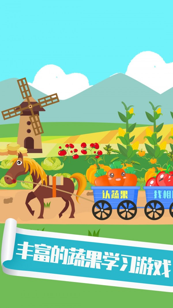 游戏中包含了十多种常见蔬菜的卡通形象和真实照片,点击旁边的小喇叭会播放蔬菜的中文发音。点击左右按钮更换蔬菜。