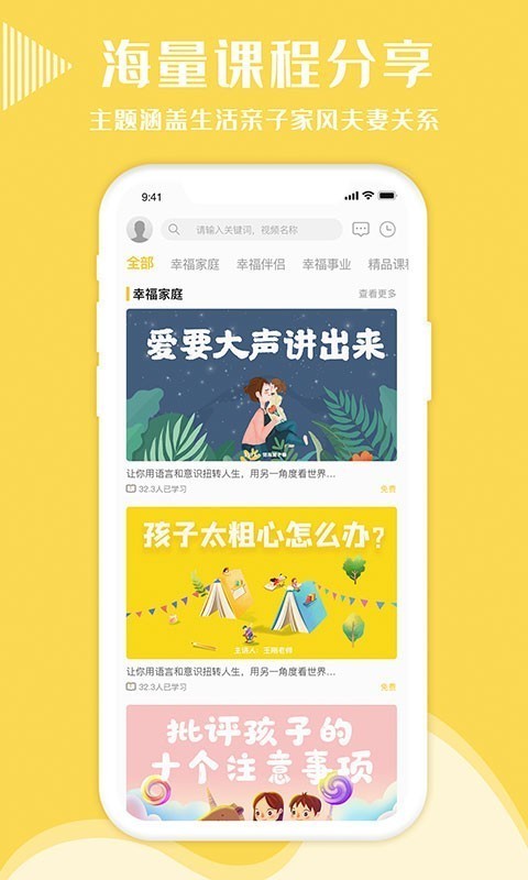 幸福得到APP以视频精品课程为主要呈现,内容分为家庭教育、亲子关系、个人成长等多个领域和板块,邀请全国一线名师、专家学者、明星大咖等录制课程,提供最前沿、最落地、最实用的知识内容。