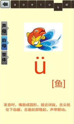 2、本应用同时配有声母、韵母、整体认知音节字母表,让孩子学习正确的基础拼音发音。