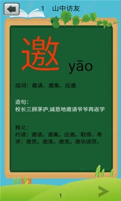 1、让小孩练习语文生字听力,同时配有对应的图片,本册每一个生字都配有对应的句子、组词、组句和朗读。
