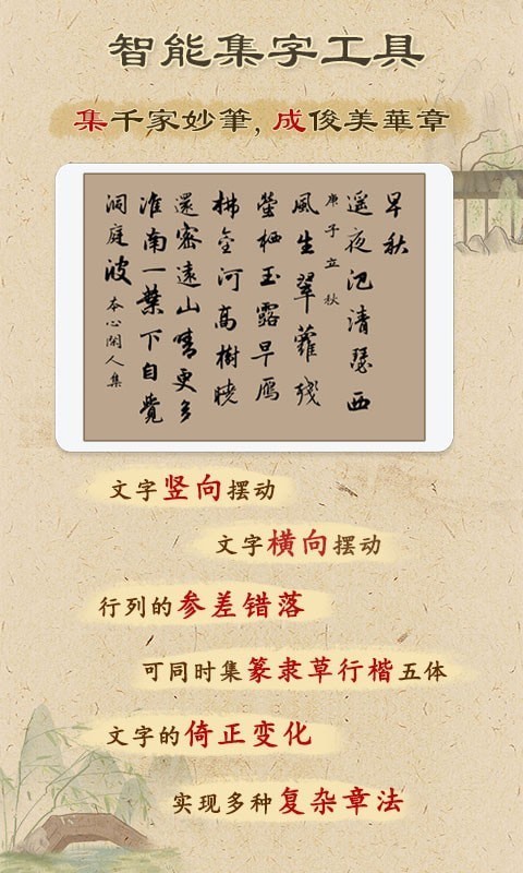 3、集字:辅助创作工具。文字竖向摆动,文字横向摆动,行列的参差错落,可同时集篆隶草行楷五体,文字的倚正变化,实现多种复杂章法。