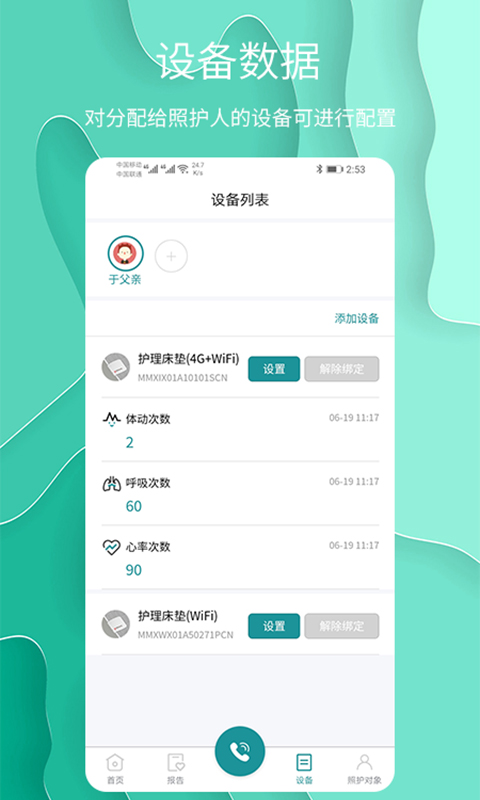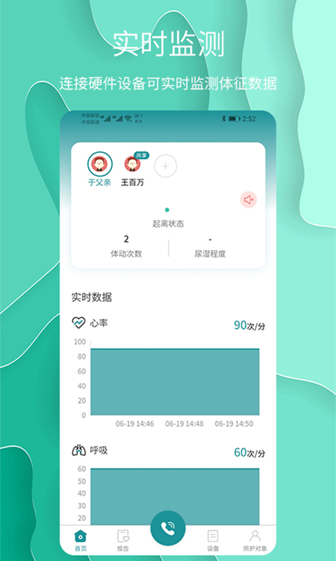 作为青岛护适通公司智慧康养平台的移动端,主要用于机构版及个人使用者对照护人员实时位置、实时体征数据的查看,以及接收报警推送、服务交互等。