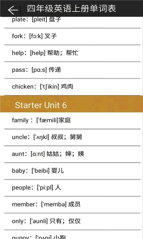1、小学英语四年级上册所有课文、单词的翻译、朗读。(单词朗读有二种模式:纯英文读、中文-英文,方便记忆)