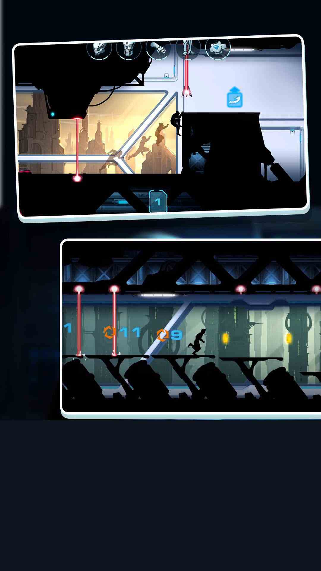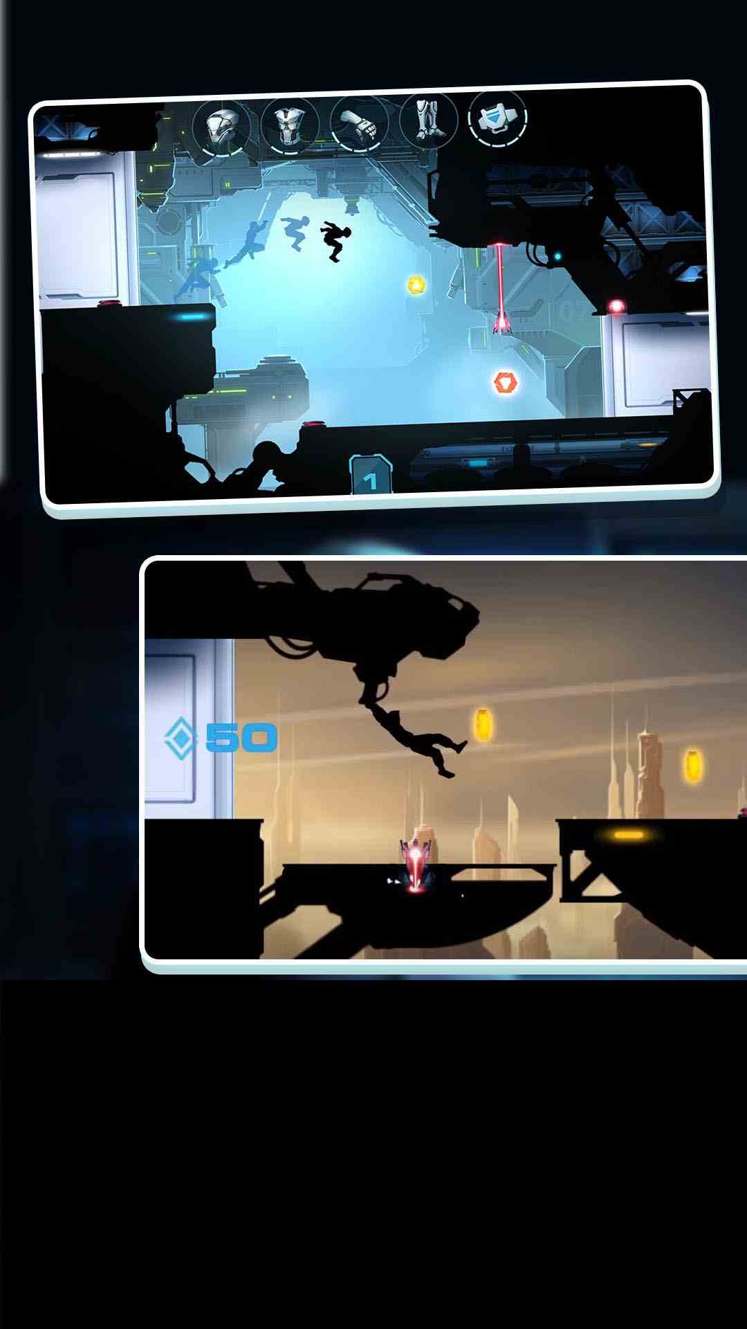 1、游戏将人物弱化成黑色的影子,让你的注意力集中在跑酷上面;