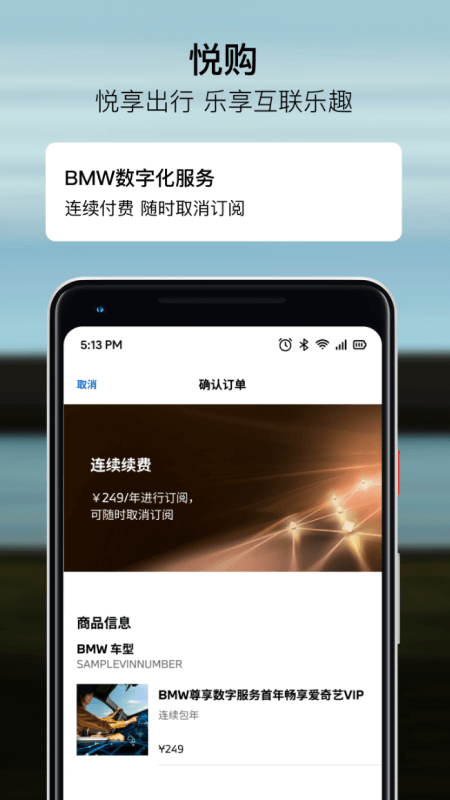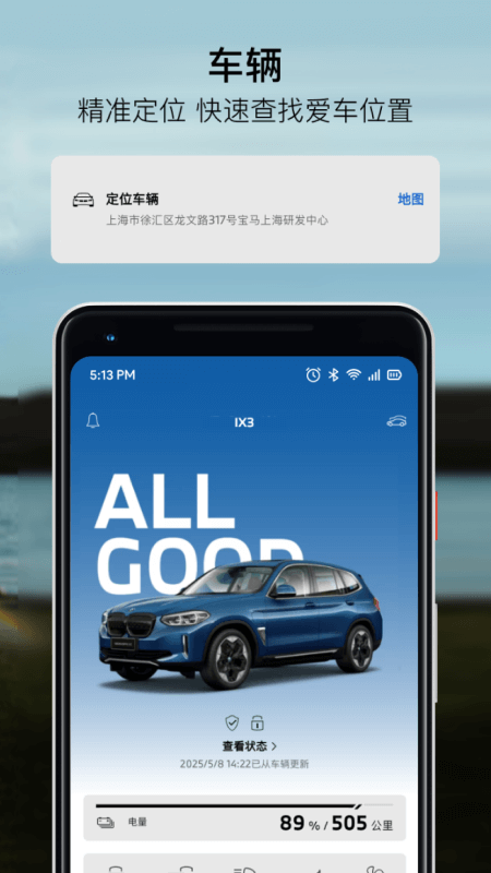 车辆:帮助BMW新车主一键激活互联驾驶服务。远程访问并管理您的爱车,轻松调节车内温度,便捷查看剩余油量、充电状态和续航里程等重要信息,驾程状态尽在掌握。