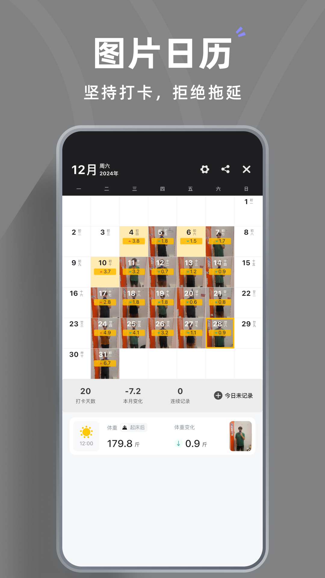 体重趋势、健康状态、记重日历一目了然。多款皮肤由您选择,还可以记录您的体重日记哦。