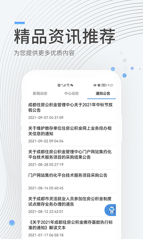 『新闻资讯』新闻动态、中心动态、通知公告,方便缴存职工随时随地了解住房公积金讯息。