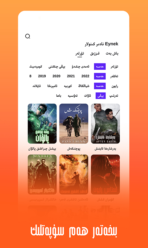 Eynek 手机客户端是中国广电新疆公司推出的维吾尔语影视客户端。创立于2015年,是一款集视频、涵盖电影、电视剧、综艺在内的多种类型丰富的正版视频内容库。高品质的纯视频生态APP。播放速度流畅,新片资源齐全,更新速度快,并可下载缓存。APP内所有影片很安全,无弹窗,无不良广告,为影视爱好者提供一个清洁的观看环境。视频推荐-更精彩:为您推荐更多更好的热门视频,随时观看最精彩内容画质选择-更清晰∶支持各种画质的播放和下载,带给您更高品质视觉享受。语言切换-更随意:多语言片源随意切换,中文、维语更多语言供您选择。实时更新一每日都有新增或更新的电影及影视剧等。操作便捷一一键播放,可投屏。电视剧栏目提供本土网络剧、国产剧集在线观看。电影栏目提供最新喜剧电影、动作电影、爱情电影、科幻电影、纪录片、战争片、故事片等高清电影在线观看。