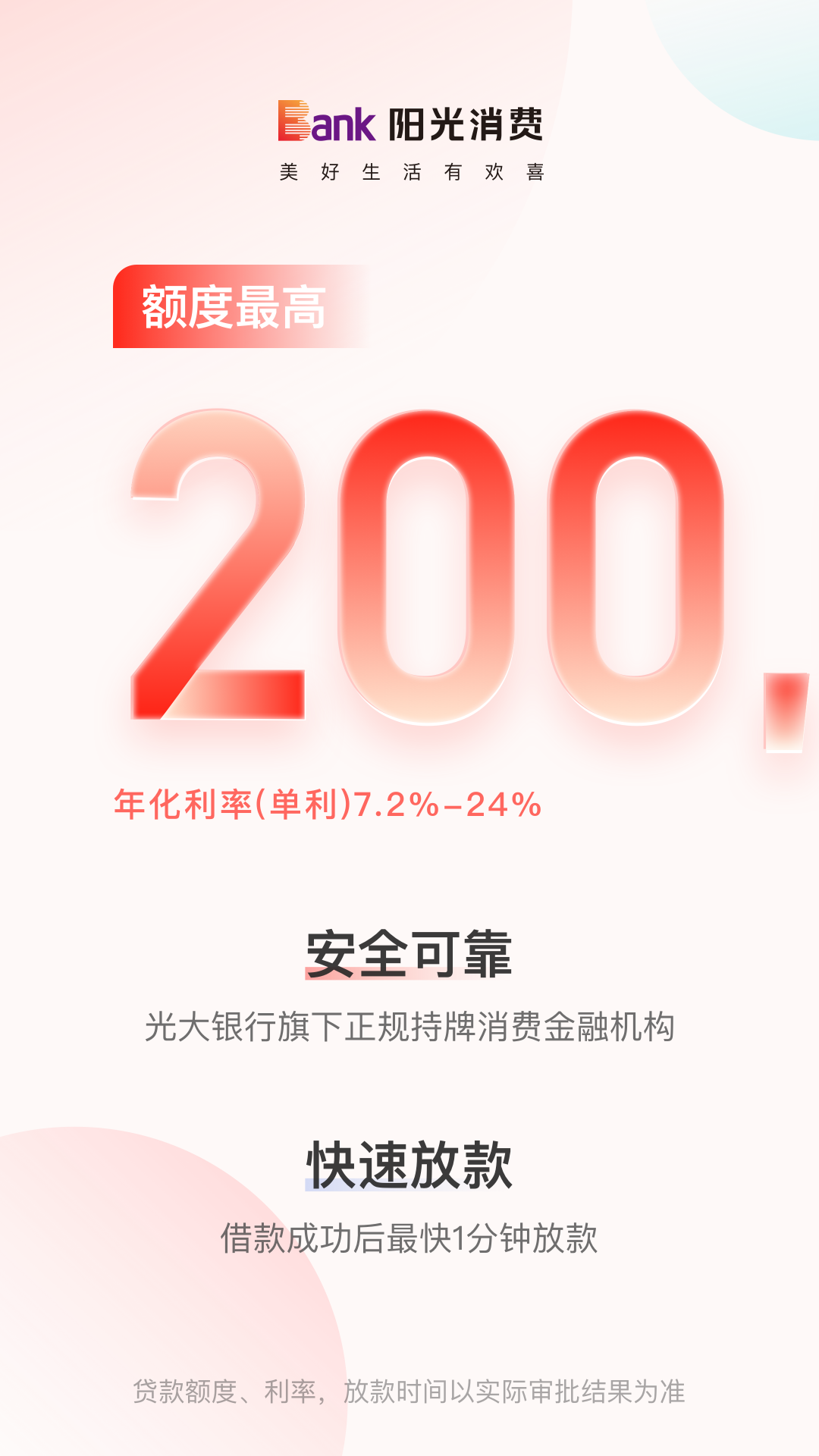 阳光消费APP电脑版是北京阳光消费金融公司推出的个人消费信贷平台,用户可在线便捷申请最高20万元、最长36期的消费贷款,享受实时审批和按日计息服务,年化利率在7.2%-24%之间。