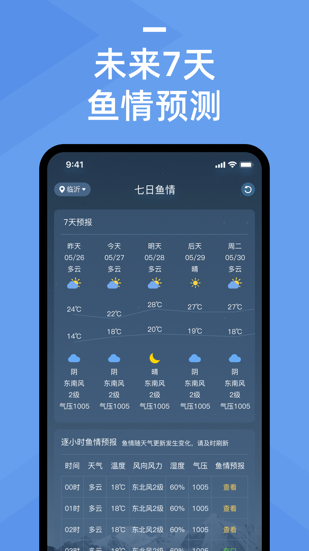 本软件通过各种天气变化来分析垂钓的鱼情,可实现逐小时鱼情预报,以及7天内逐小时鱼情预报。鱼情随着天气的变化而改变,每小时更新数据,请及时刷新。