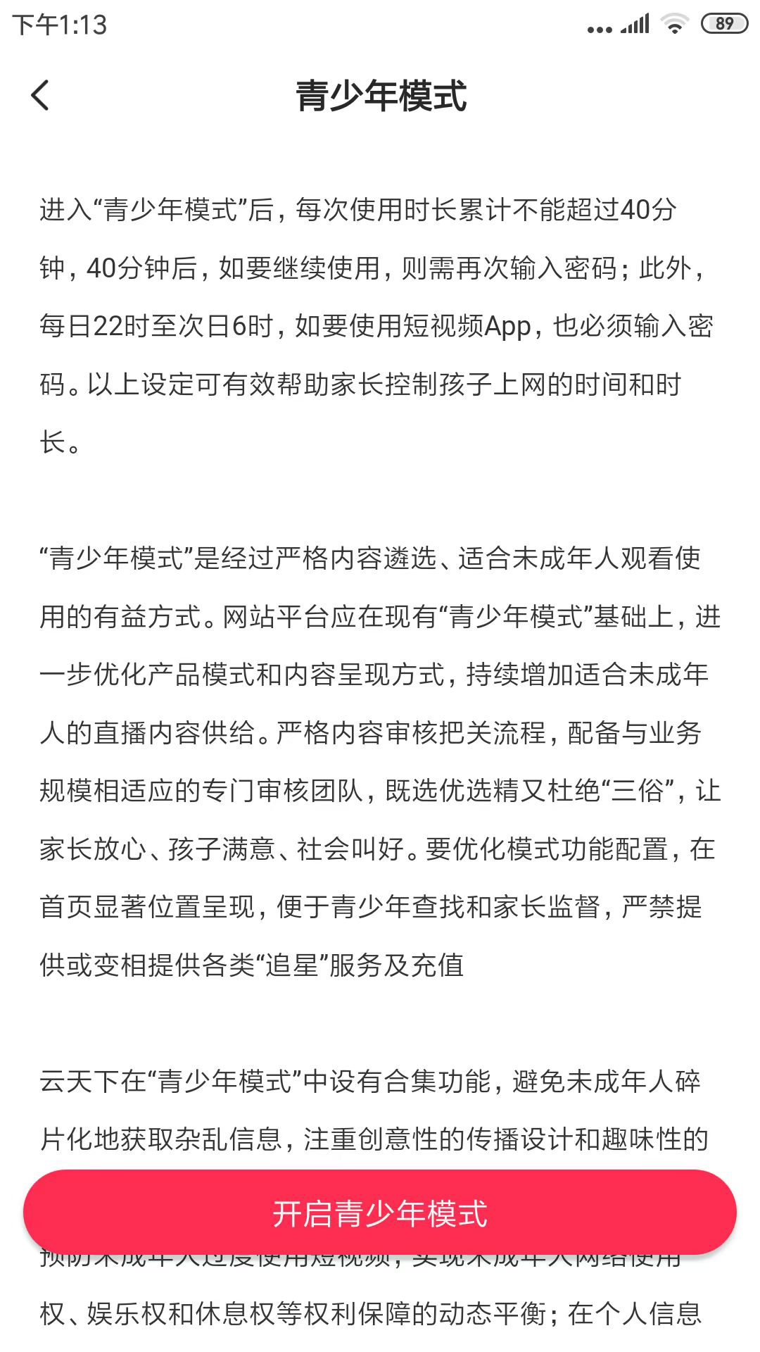 云天下是一款用户记录和分享生产、生活、艺术的直播平台,用户可免费看视频、免费看直播;用户申请主播,经实名认证后可申请直播带货,主要围绕乡村振兴、扶农助农进行商品供销对接,并设有青少年模式,青少年专属内容等,倡导健康阳光的内容。