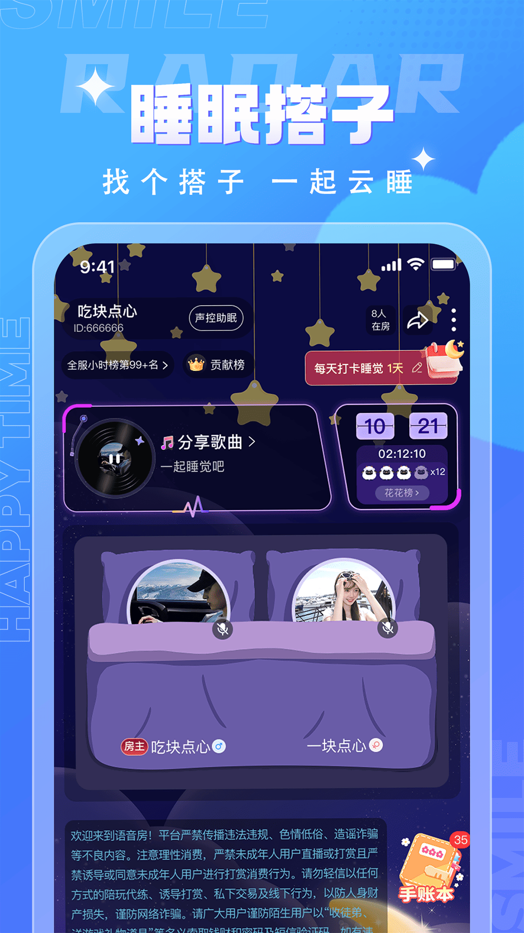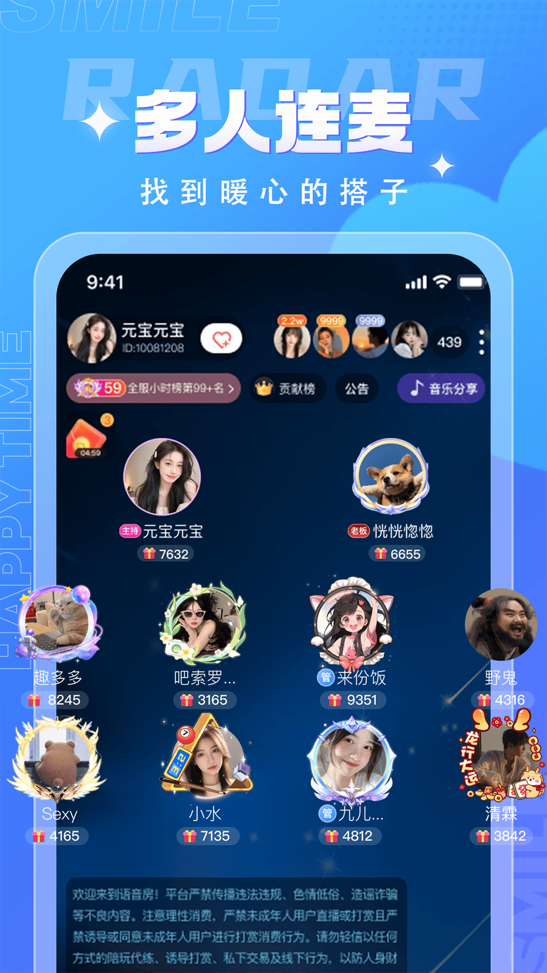作为一款温馨语音互动社交平台,如何让大家在云端更快速地,寻找到自己的SoulMate和同好,是我们一直想做的事;为了让语聊交友更加纯粹,我们抛开美颜时代下的面对面,更聚焦于“聊”这件事,通过融入多元化的玩法,如游戏开黑、电台读文,速配交友、音乐共享、K歌交友等,鼓励大家通过声音去勇敢沟通,在沉浸式对话中高效寻求共鸣、收获快乐和情感陪伴。