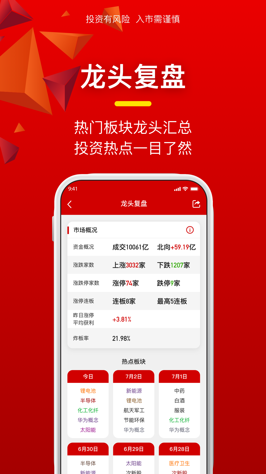 【龙头复盘】:每日市场数据总结,对当日的数据进行复盘。