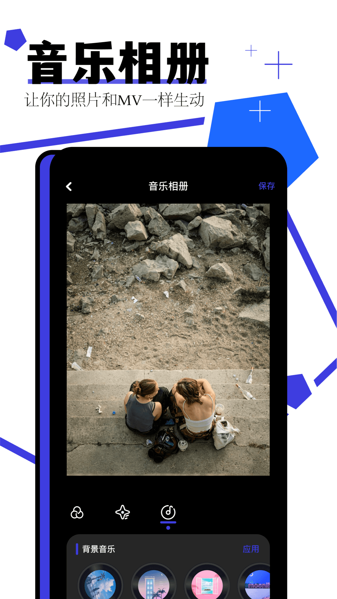 自定义制作音乐相册,添加图片选择本地音乐,自定义添加滤镜、转场等制作音乐影集,分享给你的朋友。