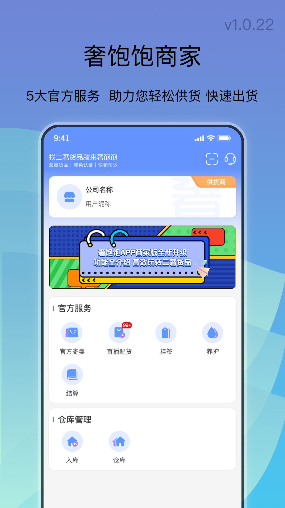 奢饱饱是由浙江蓝了个蓝科技有限公司自主开发的一站式二奢商家服务平台,专注为二奢行业商家提供线下展会、多店铺管理,线上云仓、直播选品、溯源鉴定及保养等全链路解决方案,致力于帮助二奢商家货品高效流转,利用信息数字技术帮助行业做大!