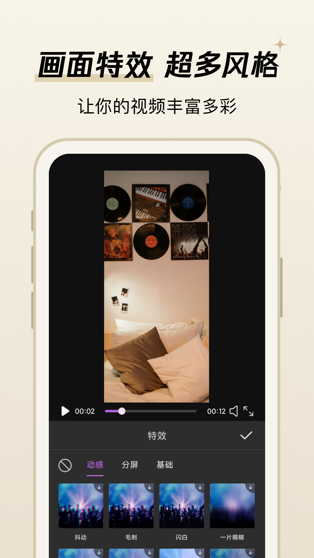 应用操作简单,轻松剪辑制作视频,支持海量影像效果的自由搭配,丰富的文字编辑方式,让你随时随地制作视频,并同时分享到各大社交网站和自己的微信朋友圈,制作视频就是这么简单、快乐、随意。