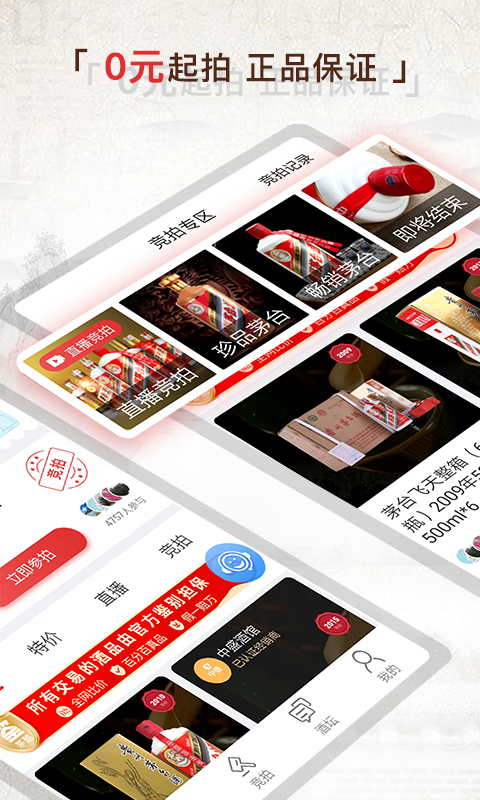 【茅台拍卖】:0元起竞拍正品茅台,参与竞拍即可获得红包奖励。直播竞拍更有现金红包奖励、酒品优惠限时享不停!