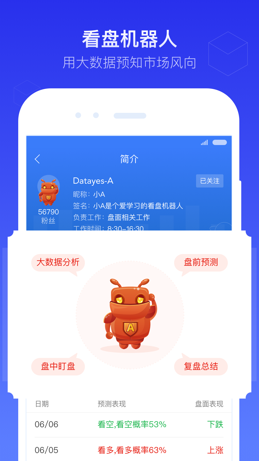 看盘机器人:负责每日盘面解说工作,包含盘前预测,盘中盯盘,收市后复盘总结