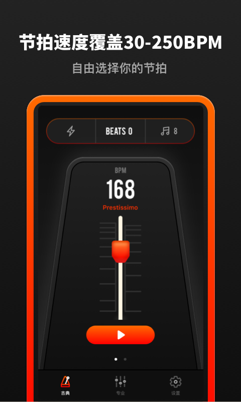 音乐节拍器以极简而又独具人性化的界面为您展现一个优雅的节拍器。它为每一位热爱音乐的人而生,让节拍节奏的掌握更方便简单,随时随地,妙不可言!