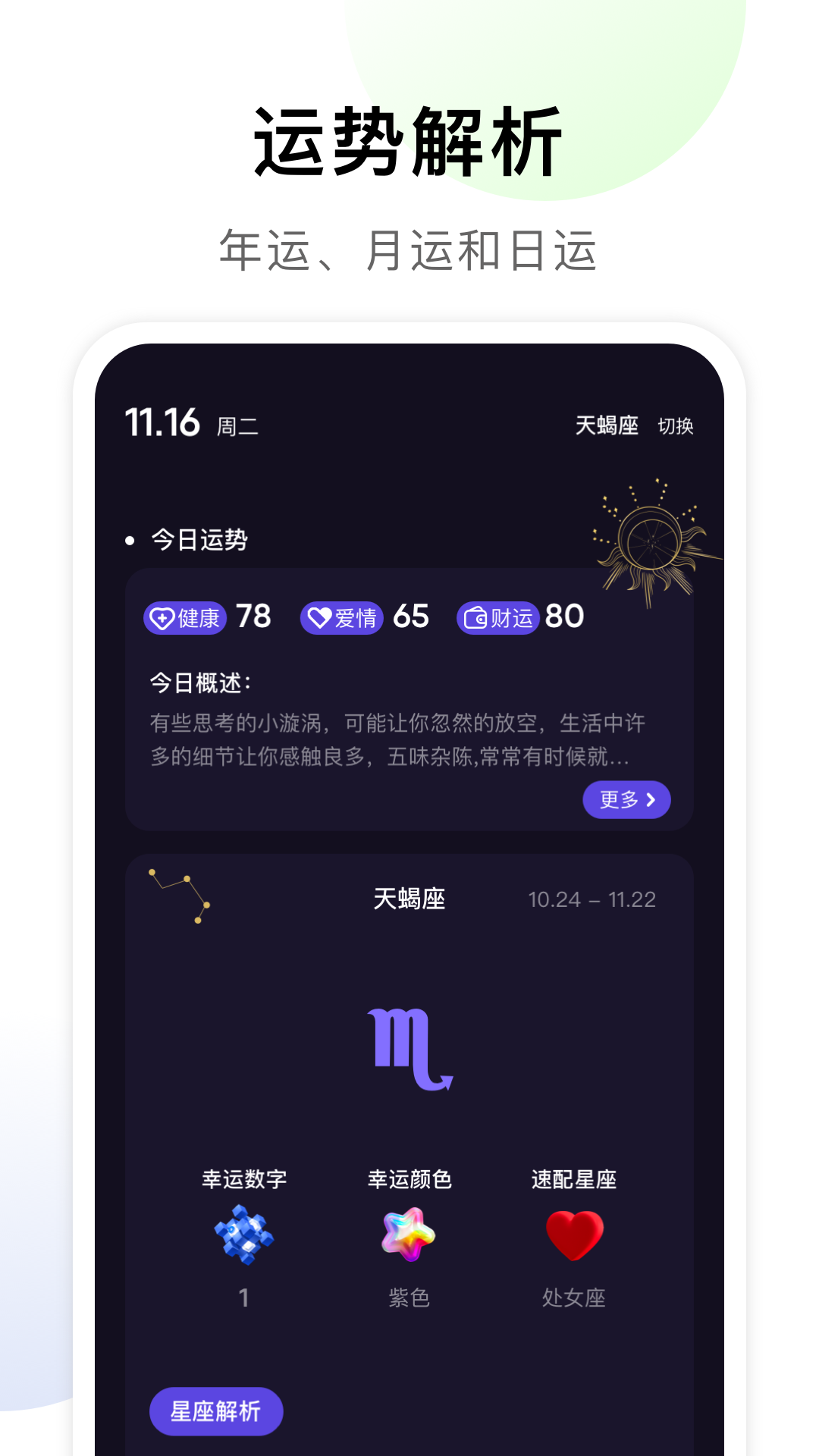 准星专家APP电脑版是一款集星座运势、解析及配对功能于一体的软件,提供日、周、月、年的爱情、健康、财运、工作运势查询,以及星座幸运数字和颜色,还能分析两个星座的配对情况。