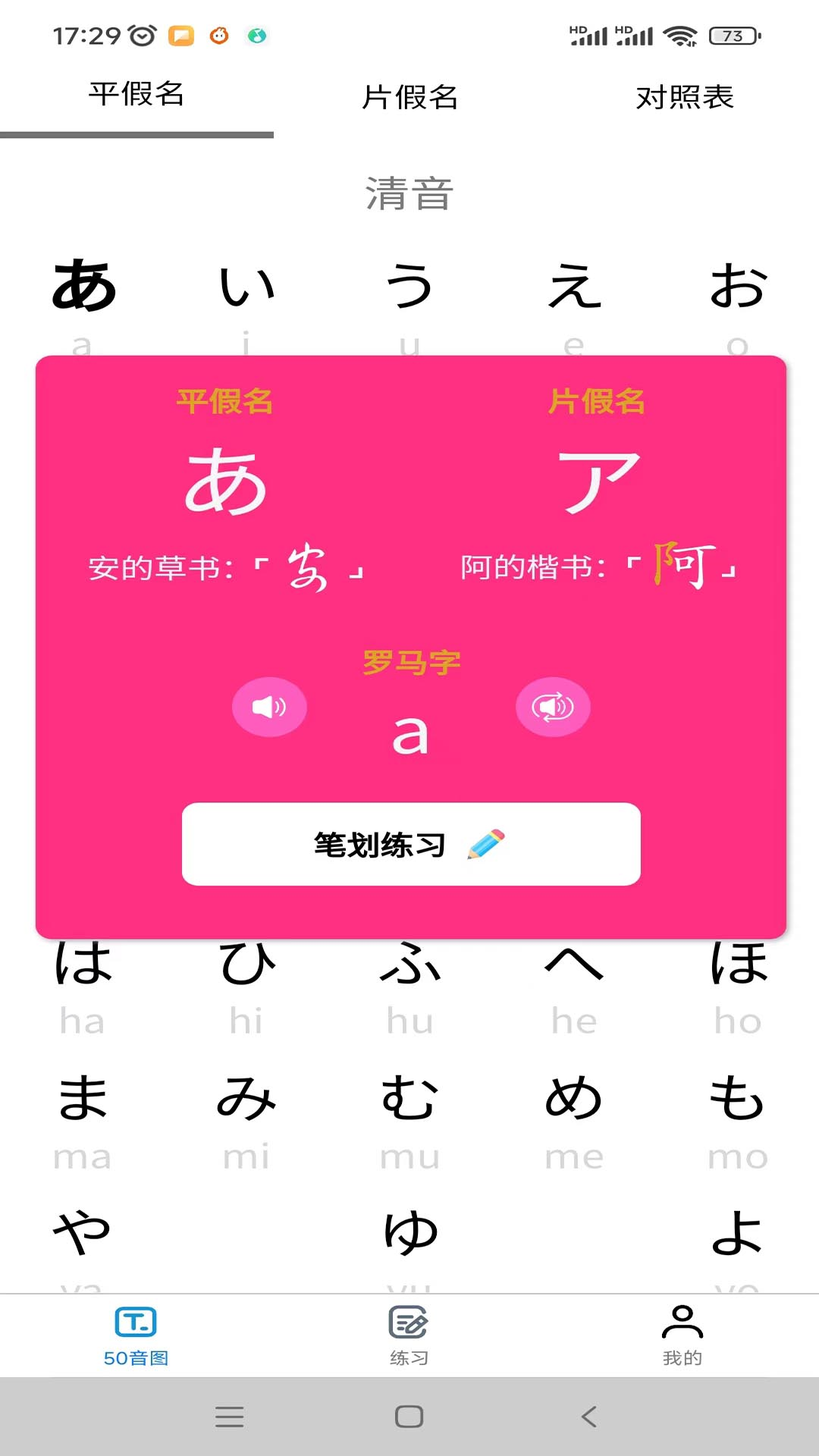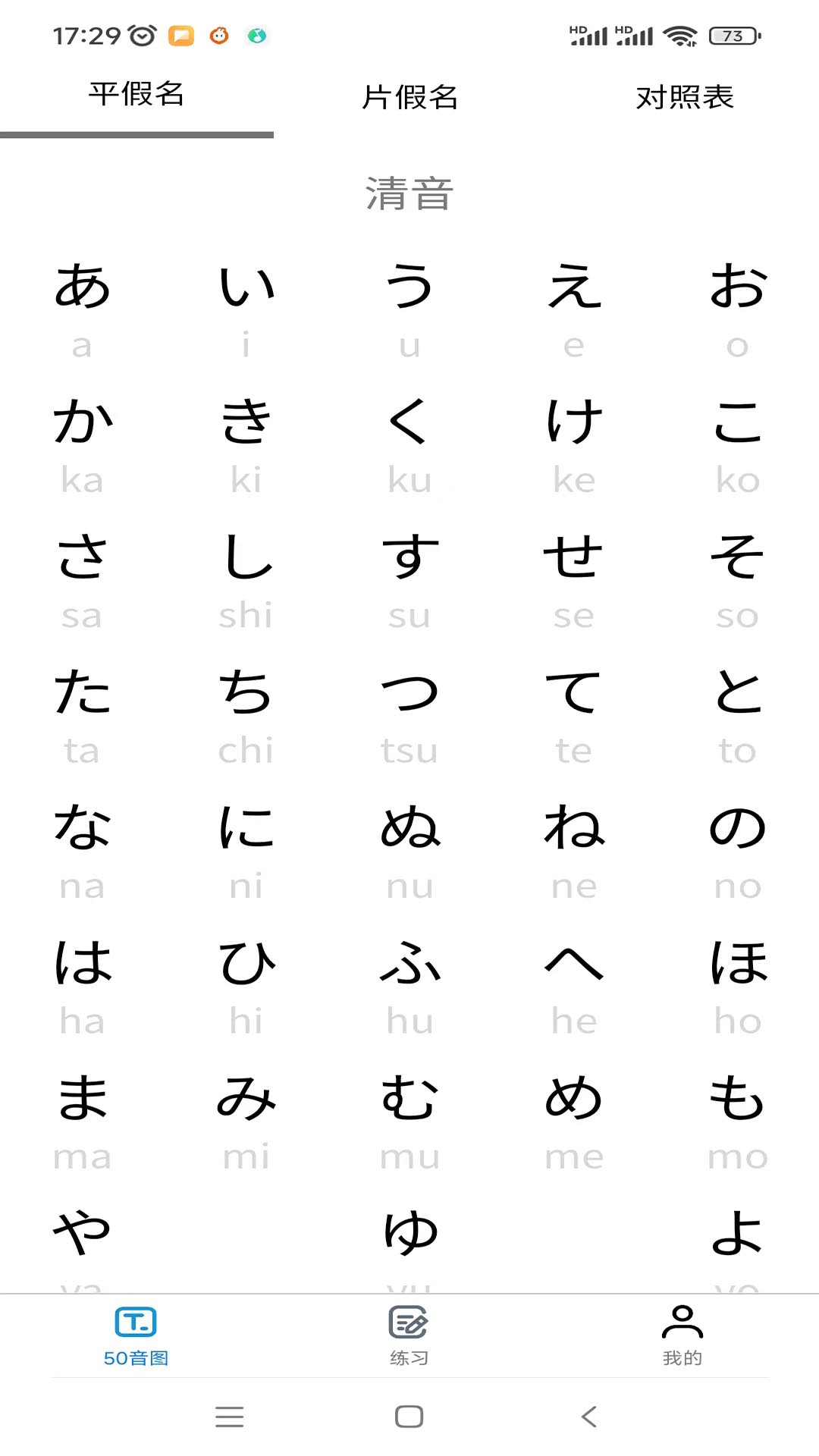 木木五十音APP电脑版专注于日语初学者的基础训练,通过丰富的字形和发音组合练习,以及平假名和片假名的书写笔顺练习,帮助用户扎实掌握五十音图,为日后的日语学习打下坚实基础,增强学习自信。