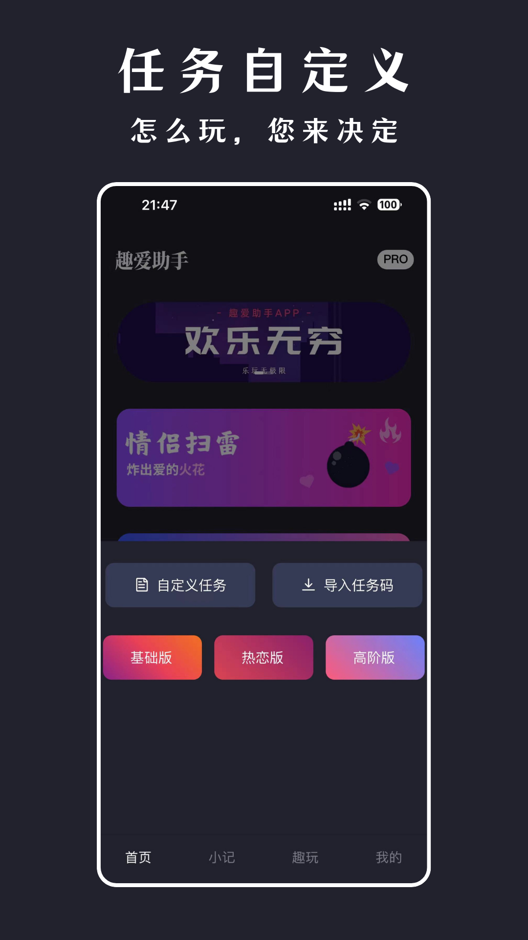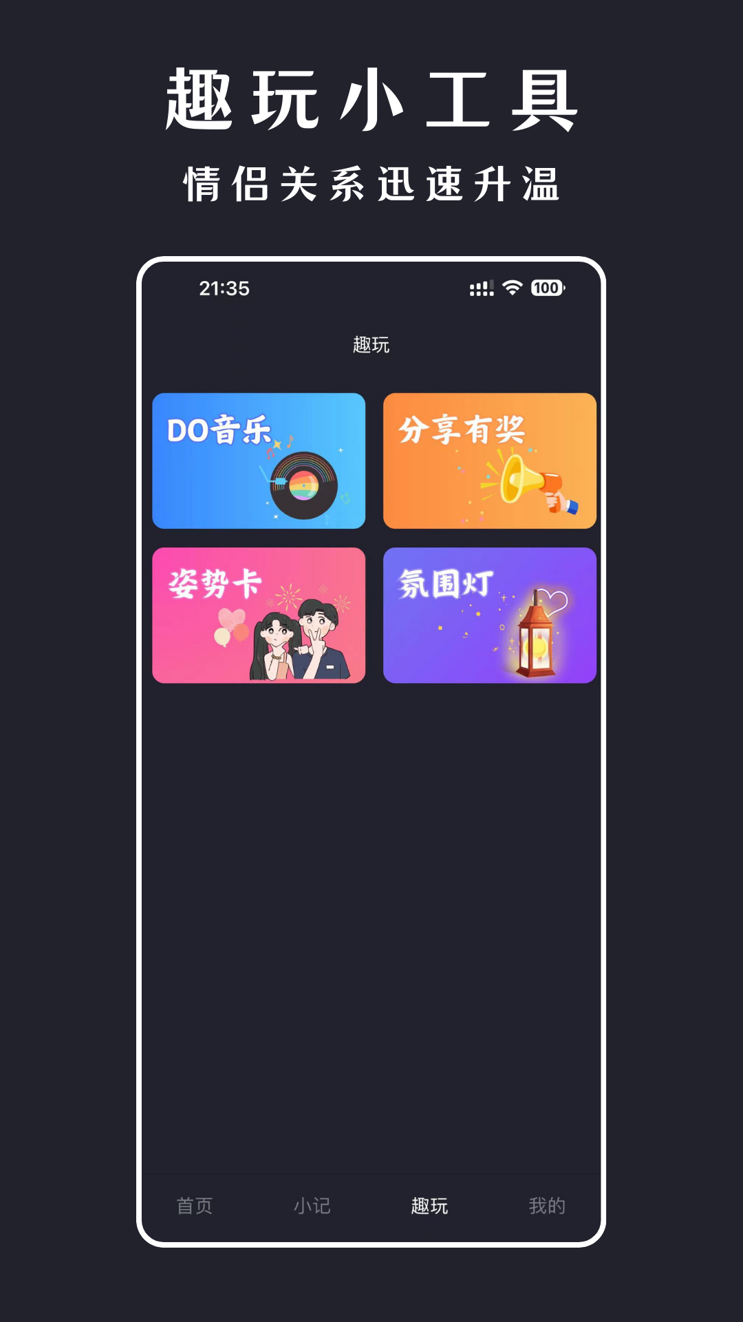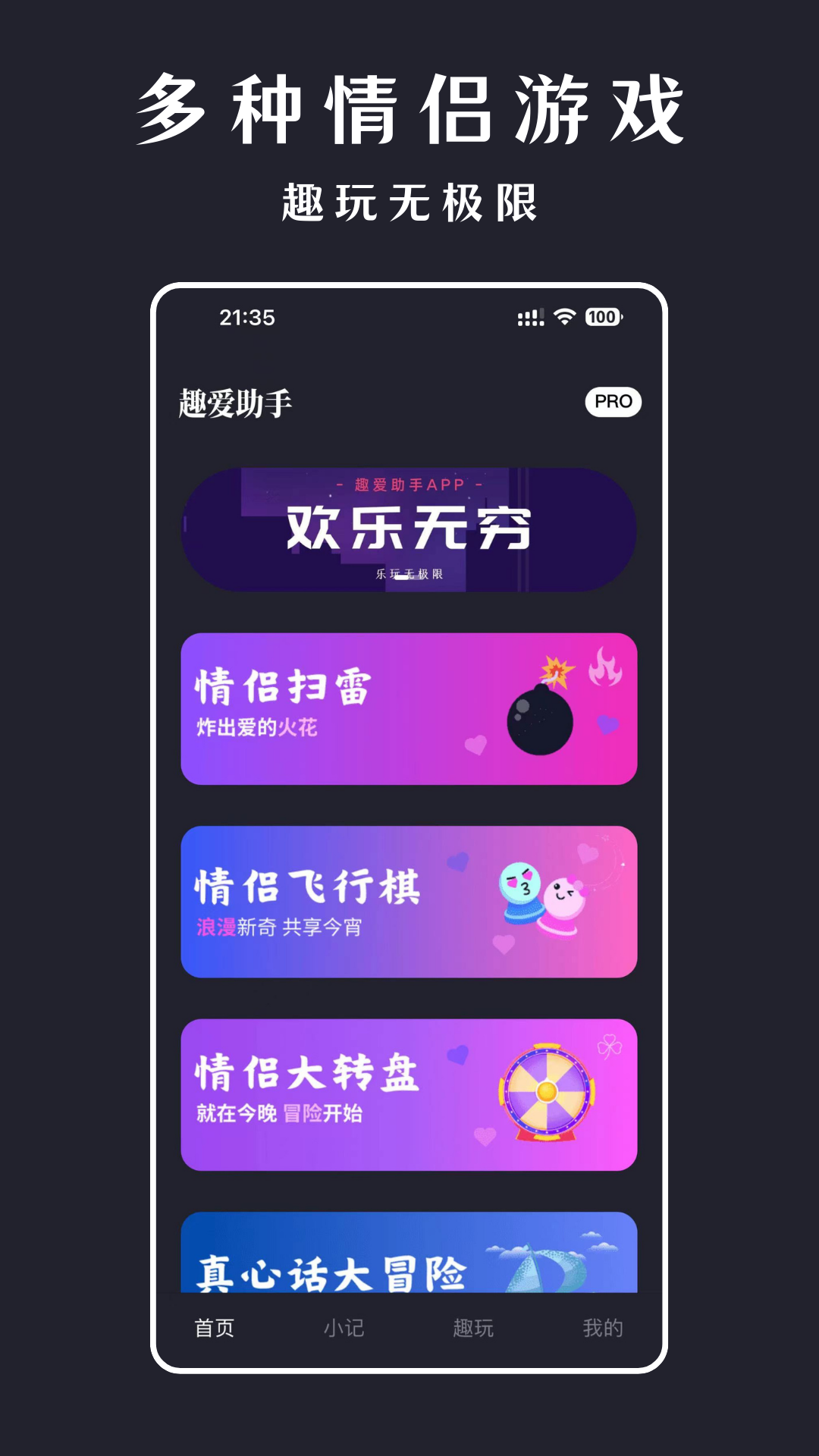 趣爱助手,乐趣无极限。情侣浪漫升温工具,情侣约会游戏APP。多种氛围灯,海量DO音乐,多种小游戏,欢乐无穷!