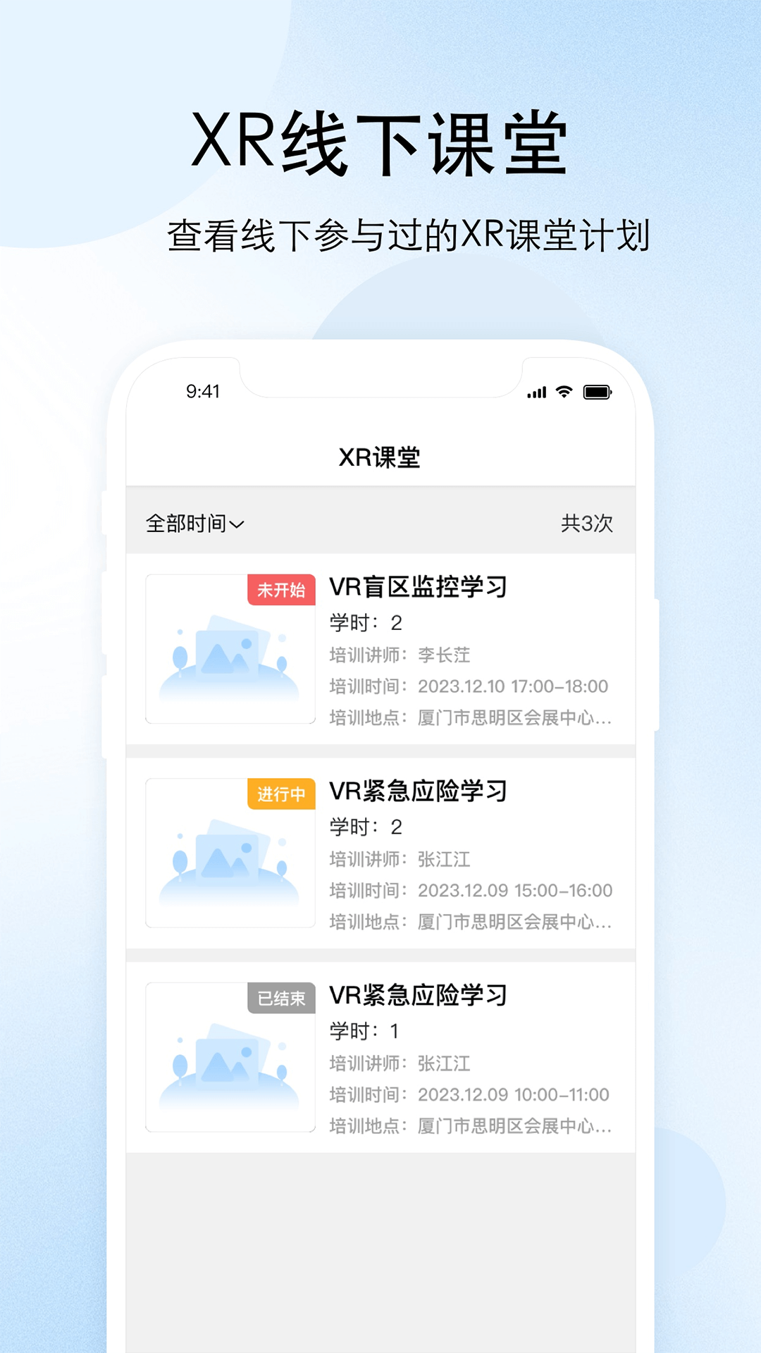 驾安之星APP是一款致力于司机驾驶安全教育培训的平台产品。 在线学习:运营商可以给旗下企业客户进行月度学习计划制定,企业客户内部学员可以使用APP进行相应月度计划课程的在线学习,学习完成后将记录学习学时。 XR线下课堂:运营商可以根据旗下企业客户需求,制定XR课堂学习计划,到场学员可以扫描课堂签到码进行课程签到或者扫描现场设备二维码,进行课程上机使用,学习完成后将记录学习学时。