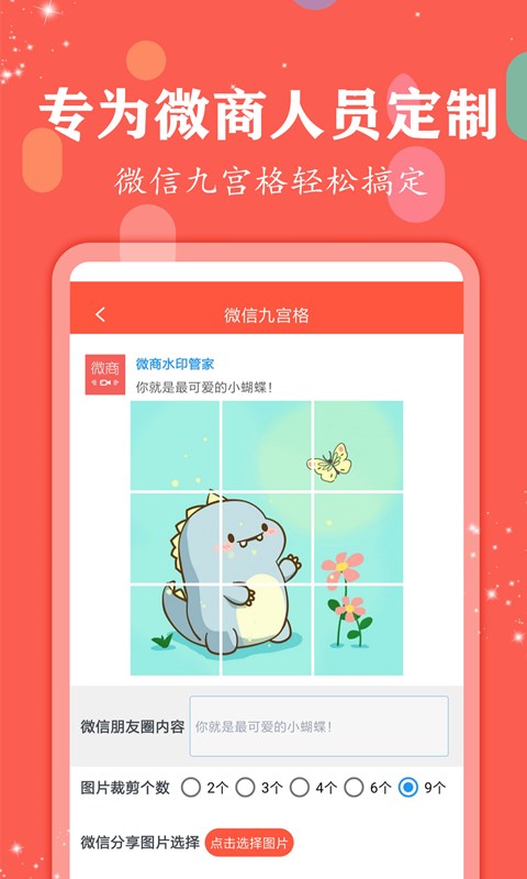 【1】微信九宫格制作,轻松选定图片制作2,3,4,6,9多种拆分整图。让你的朋友圈图片别具一格!轻松达到微商水印推广营销!