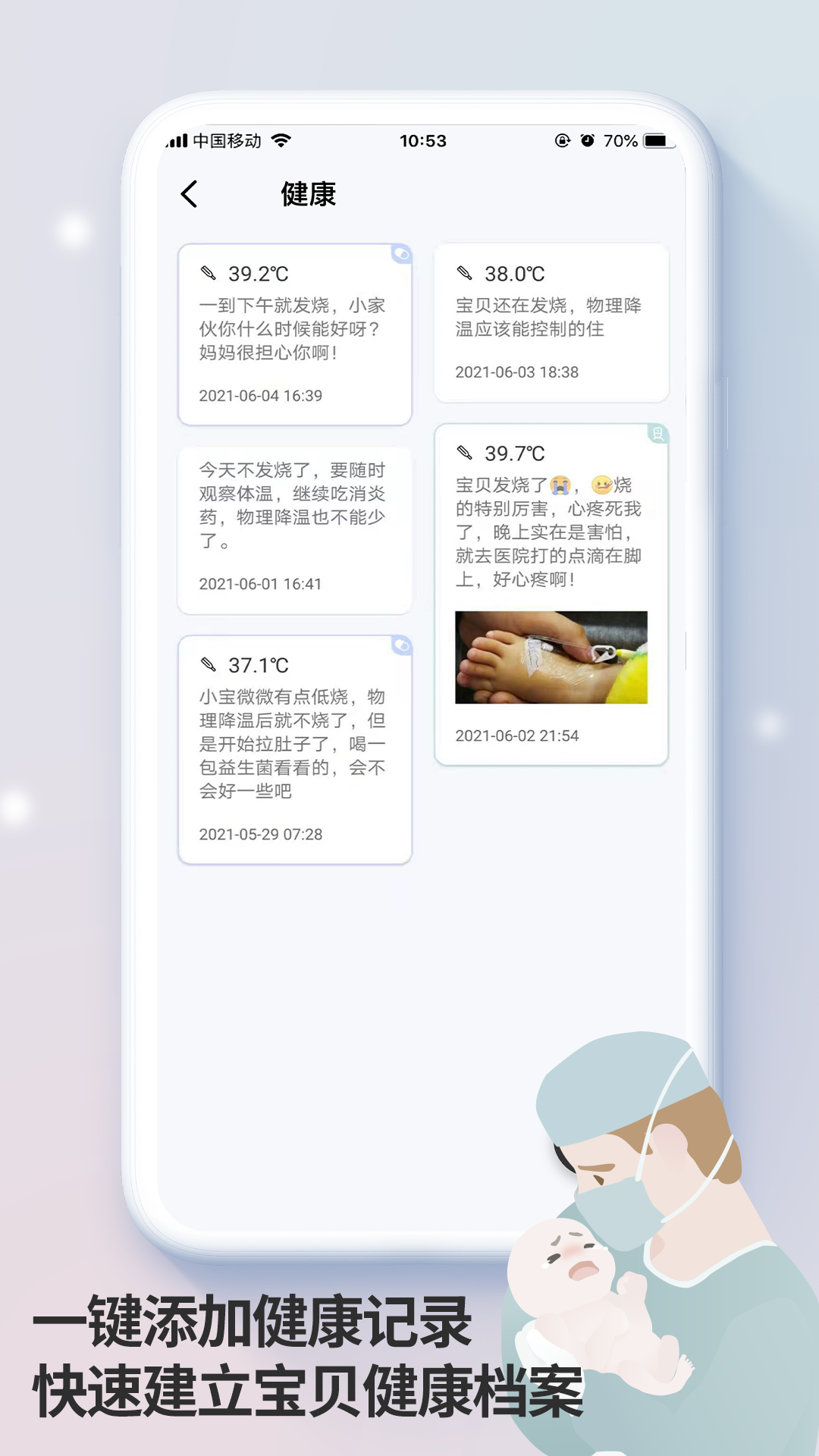 轻松记录宝贝的健康信息,包括体温、看医生、喂药、症状等,列表显示方便您的查看