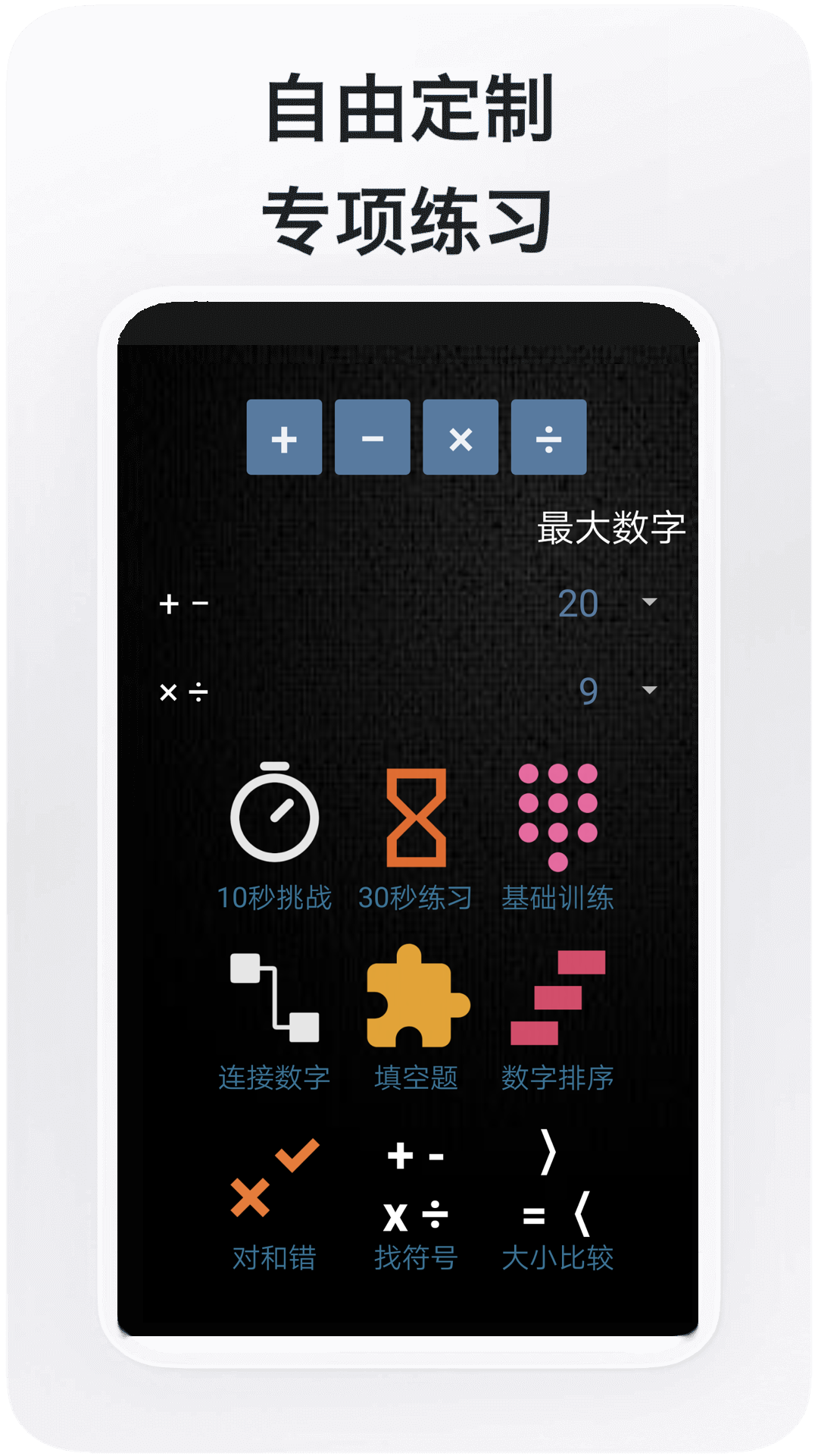 - 用户进入定制训练模块,选择数字或加、减、乘、除。